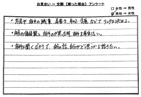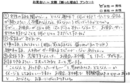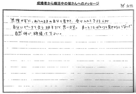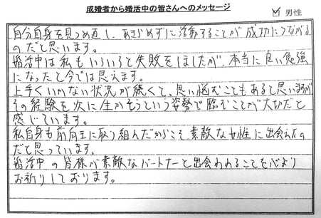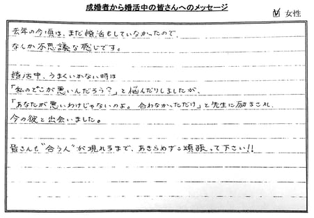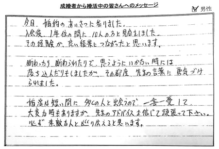 ○ 当センターで成婚された会員の皆さまの最近のいくつかの嬉しい事例と、お寄せいただいた皆さまからのさまざまな思いやご意見の中から、いくつかを抜粋してそのまま直筆でご紹介しています。直筆につき読みにくい箇所がありますが、ご了承ください。下方にスクロールすると、ご覧いただけます。